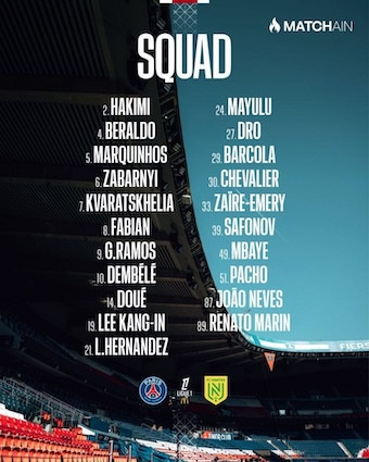巴黎对阵南特大名单